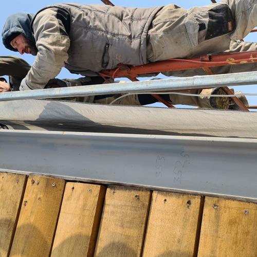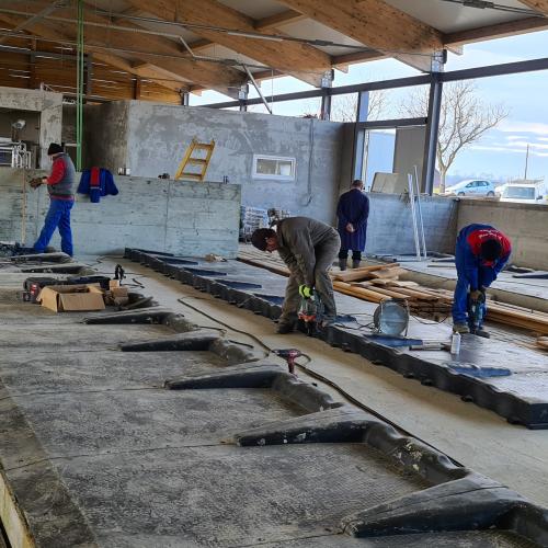 Montaža kovinske opreme v hlevu, zaves, ležalnih gum in betonskih rešetk.